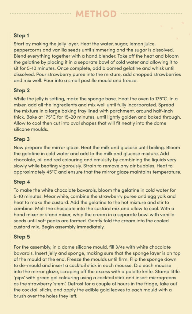 To celebrate their incredible achievement, we present you with a seasonally sweet strawberry dessert recipe from the contestants themselves. This strawberry and pink peppercorn mirror glaze mousse is loaded with summer flavour and perfect for Wimbledon season, but it’s certainly a challenge!